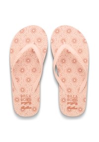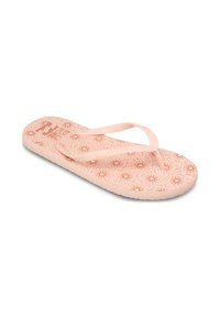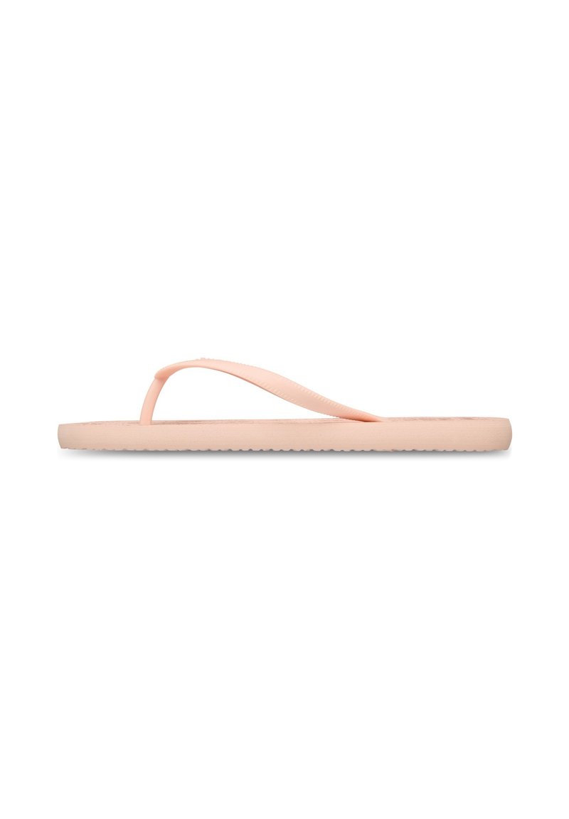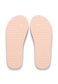 Tongs roses en caoutchouc avec une semelle plate, des lanières fines et une semelle intérieure texturée. Design simple, construction légère.