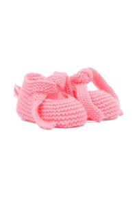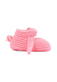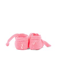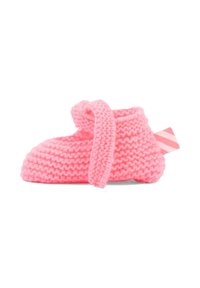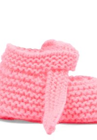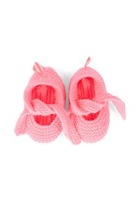 Chausson de bébé tricoté en rose doux avec une bride repliée et une étiquette en tissu rayé rose au talon, isolé sur fond blanc.