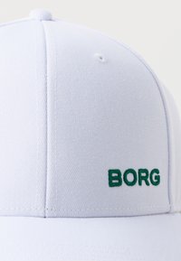Casquette de baseball blanche avec une visière courbée et le texte vert « BORG » brodé sur le panneau avant, présentée sur un fond clair uni.
