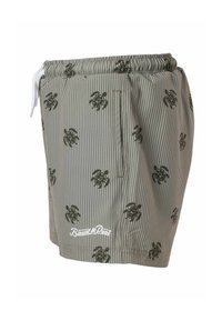 Shorts de bain vert olive avec fines rayures verticales et imprimés tortue noirs, dotés d'un cordon blanc et du logo « Bonyto » sur l'ourlet.