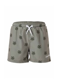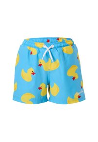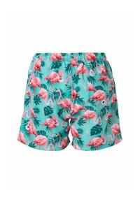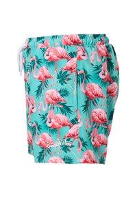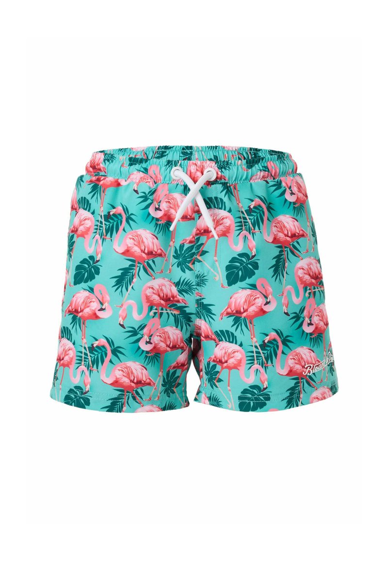 Shorts de bain turquoise avec imprimé flamants roses et feuilles tropicales vertes, taille élastique et cordon blanc.
