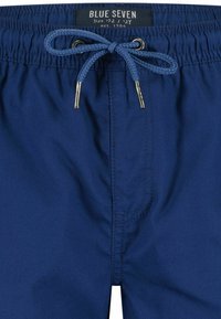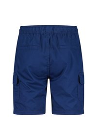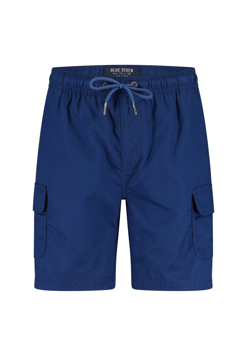 Shorts cargo bleus en tissu léger, avec une taille à cordon, deux poches latérales et une couleur unie bleu marine.