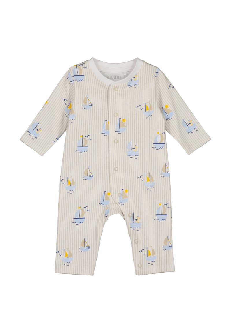 Body bébé beige à rayures avec manches longues, présentant un motif de voilier en bleu et jaune ; fermetures à boutons-pression à l'avant pour un habillage facile.