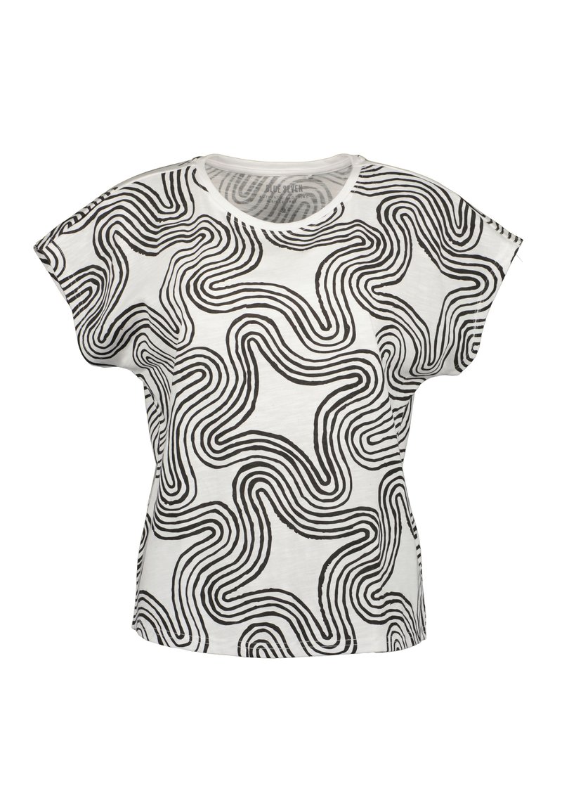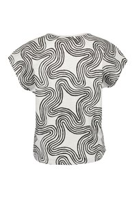 T-shirt blanc à manches courtes avec un motif de lignes ondulées noires, à coupe ample et col rond, fabriqué en tissu léger.
