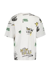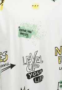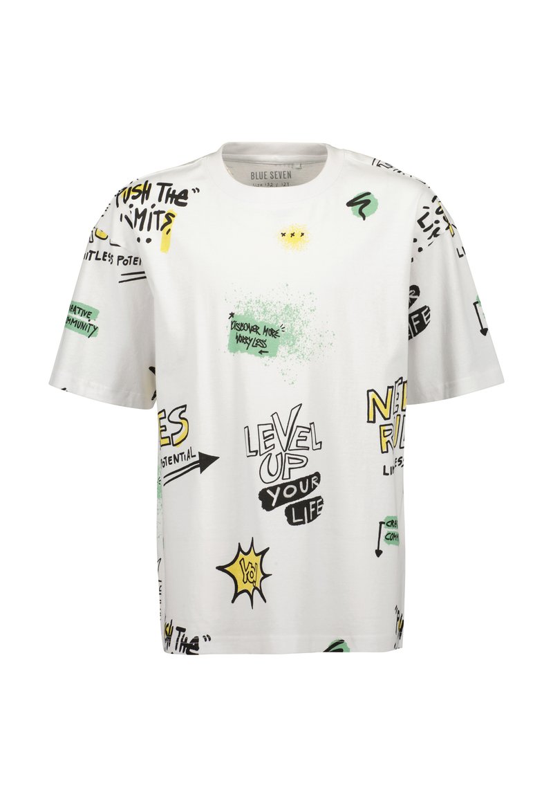 T-shirt en coton blanc avec une coupe décontractée, des manches courtes et des impressions graphiques colorées, y compris des phrases en noir, jaune et vert.