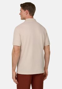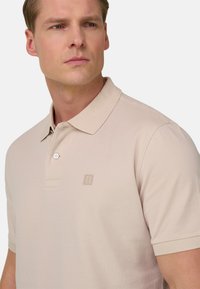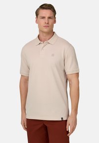 Homme portant un polo beige à manches courtes et un pantalon couleur rouille, debout devant un fond clair uni, faisant face à l'avant.