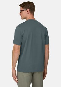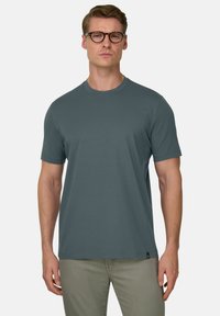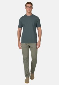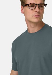 Homme aux cheveux bruns courts et portant des lunettes, vêtu d'un t-shirt à manches courtes bleu sarcelle uni et d'un pantalon de couleur claire, debout devant un fond clair.