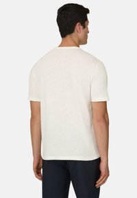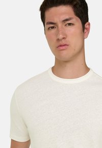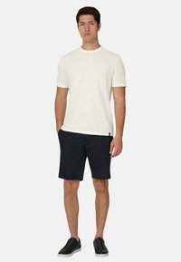 Modèle masculin portant un t-shirt blanc uni à manches courtes et col rond, accompagné d'un pantalon foncé, debout devant un fond clair uni.