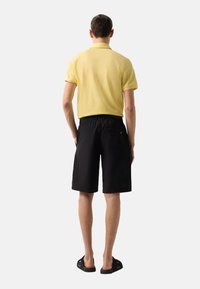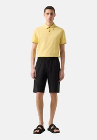 Homme portant un short à taille élastique noire, des sandales à brides noires et une chemise jaune, debout les mains détendues le long du corps.