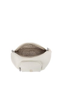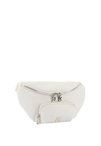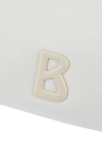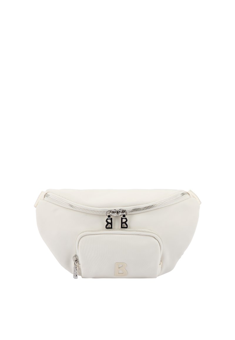 Sac banane blanc avec une grande poche principale zippée et une poche avant plus petite zippée, toutes deux équipées de tirettes de fermeture éclair argentées avec le logo "B".