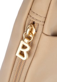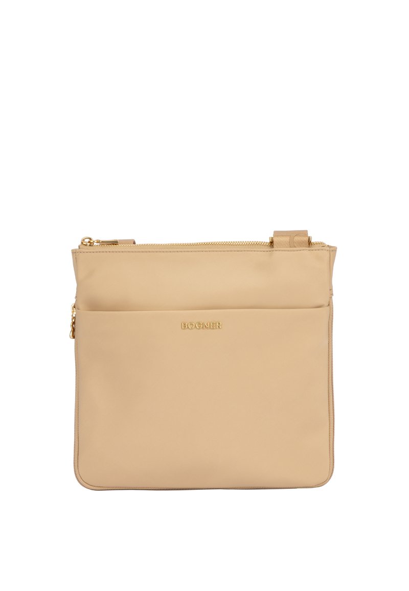 Sac bandoulière rectangulaire beige avec fermeture éclair dorée et petit logo "BOGNER" doré centré sur la poche avant.