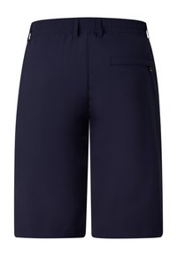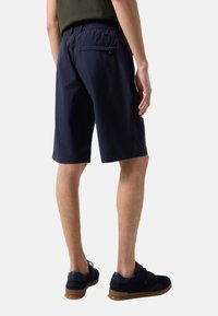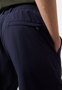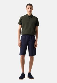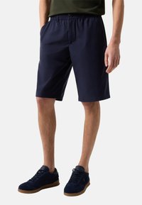 Homme portant un short bleu marine jusqu'aux genoux et des baskets bleu marine avec des semelles marron, debout les mains détendues le long du corps.