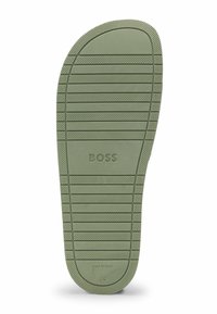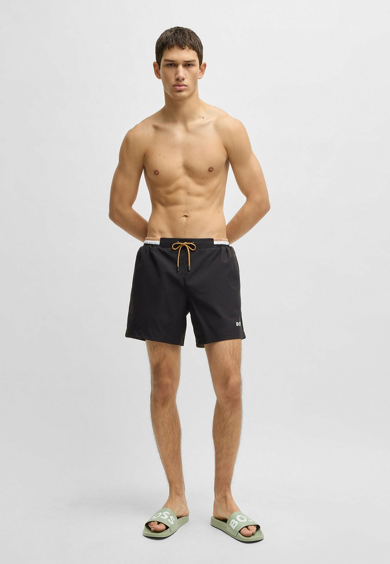 Jeune homme debout, les bras dans le dos, portant un short de bain noir avec cordon et des sandales vertes avec l'inscription « BOSS ».