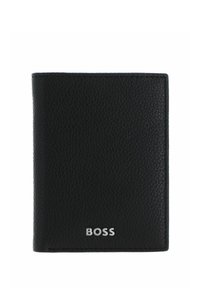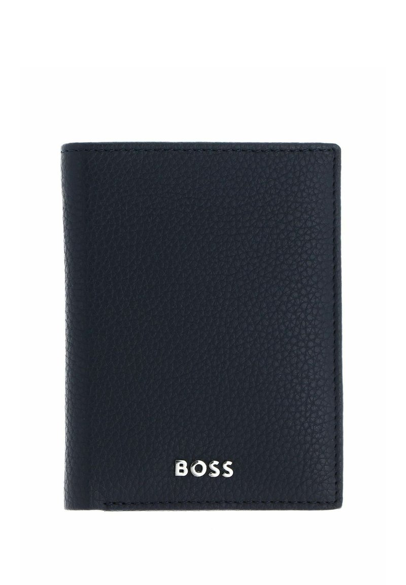 Portefeuille bifold en cuir texturé noir avec le logo argenté "BOSS" sur le devant, présenté fermé sur fond blanc.