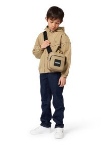 Garçon portant une veste à capuche beige, un jean bleu foncé, des baskets blanches et un sac bandoulière beige avec le logo « BOSS » sur la poche avant.