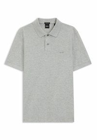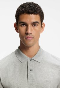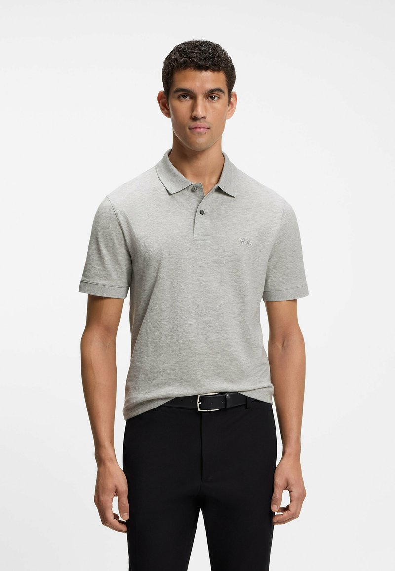 Jeune homme portant un polo gris clair à manches courtes, rentré dans un pantalon noir avec une ceinture noire, debout devant un fond blanc uni.