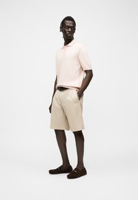 Jeune homme à la peau foncée et aux cheveux tressés porte un polo rose clair à manches courtes, rentré dans un pantalon beige avec une ceinture noire.