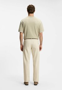Jeune homme debout, portant une chemise beige à manches courtes avec un petit logo brodé et un pantalon clair avec une ceinture marron.