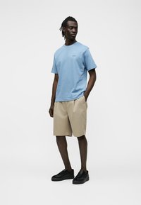 Homme avec des dreadlocks portant un t-shirt bleu clair « Boss Tennis Club » affichant des raquettes de tennis et un graphique de court, pantalon beige, de dos.