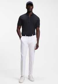 Homme portant un polo noir à manches courtes avec fermeture éclair, rentré dans un pantalon blanc avec une ceinture noire, debout devant un fond uni.
