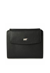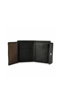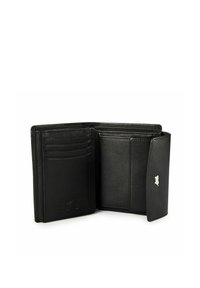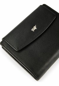 Portefeuille en cuir noir avec fermeture à rabat et petit emblème argenté de rhinocéros centré sur le devant.