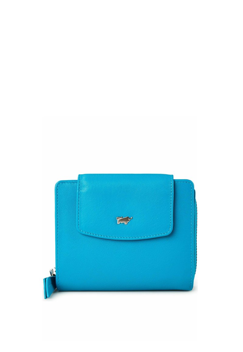 Portefeuille en cuir bleu vif avec rabat avant arborant un petit emblème animalier argenté et compartiment zippé sur le côté.
