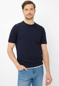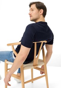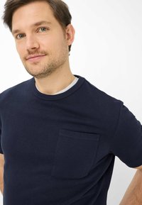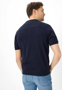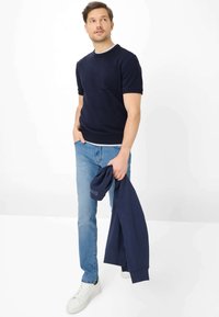 Homme portant un pull à manches courtes bleu marine avec une poche poitrine et un jean bleu clair, debout avec une main dans la poche sur fond blanc.