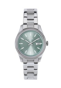 Femme souriante en haut blanc sans manches ajuste sa montre-bracelet argentée avec un cadran bleu, les yeux fermés et la tête légèrement inclinée vers l’avant.
