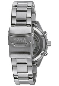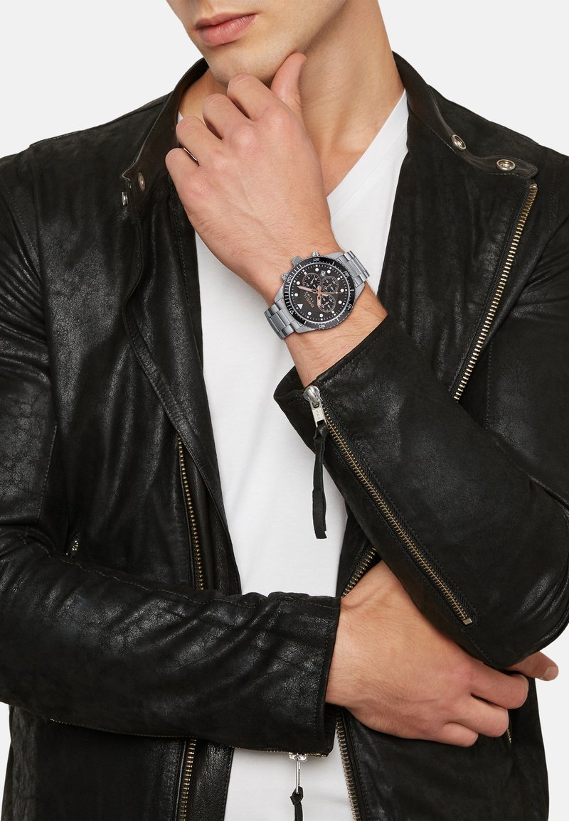 Montre chronographe en argent avec un cadran noir, des accents argentés et un bracelet en acier inoxydable, portée sur un poignet contre une veste en cuir noir.
