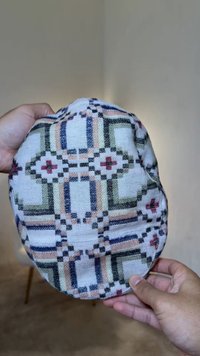 Casquette plate avec des motifs géométriques et floraux multicolores en rouge, bleu, vert et beige sur un fond clair.