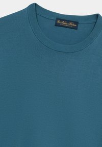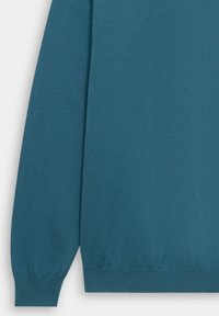Pull à manches longues couleur sarcelle avec col rond, poignets et ourlet côtelés, présenté à plat sur un fond blanc.