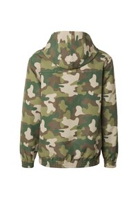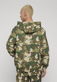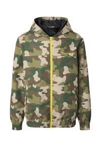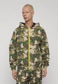 Personne portant une veste camouflage vert et marron avec une fermeture éclair jaune et un pantalon assorti, debout devant un fond uni.