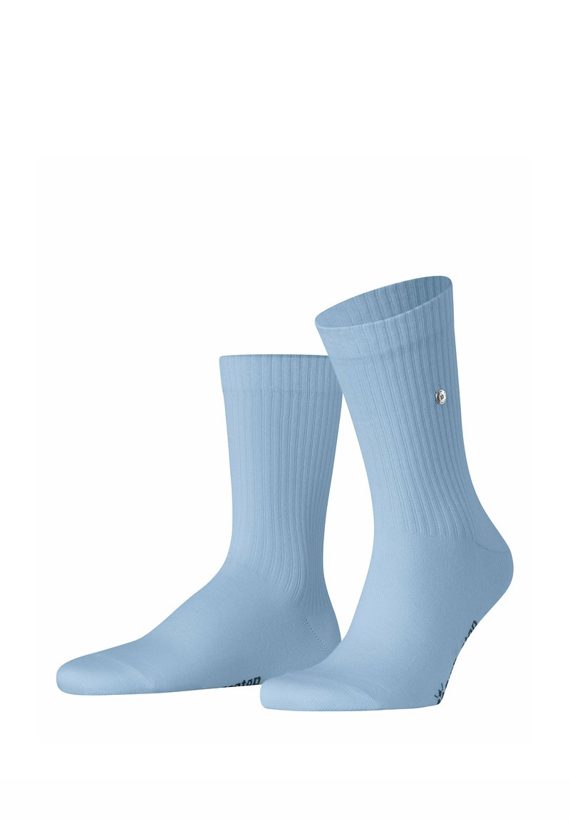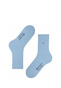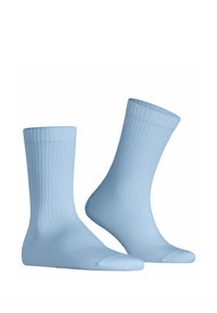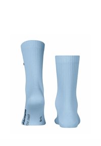 Paire de chaussettes basses bleu clair à texture côtelée avec un petit logo rond sur le dessus, isolées sur fond blanc.