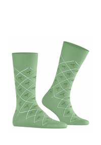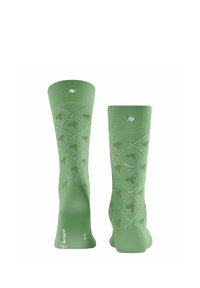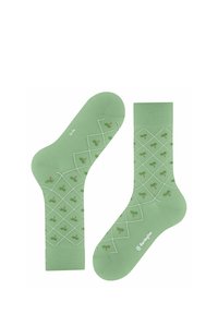 Chaussettes vertes avec des motifs en losange blancs ornés de petits palmiers dispersés sur le tissu, présentées debout et côte à côte.