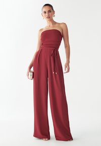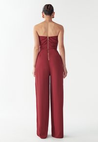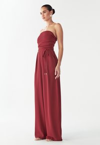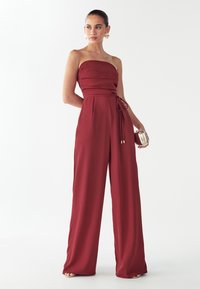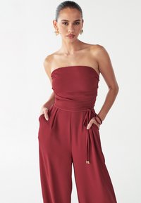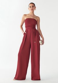 Combinaison grenat au design sans bretelles, taille cintrée et pantalons larges. Confectionnée en tissu lisse avec des accents métalliques discrets.