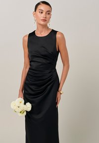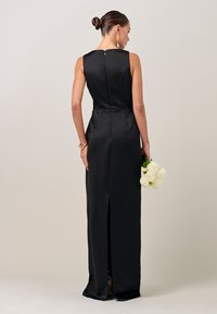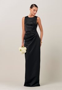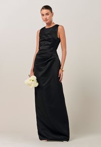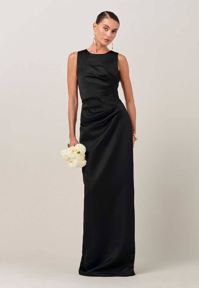 Femme en robe noire sans manches, longue jusqu'au sol, tenant un petit bouquet de fleurs blanches devant un fond beige uni.