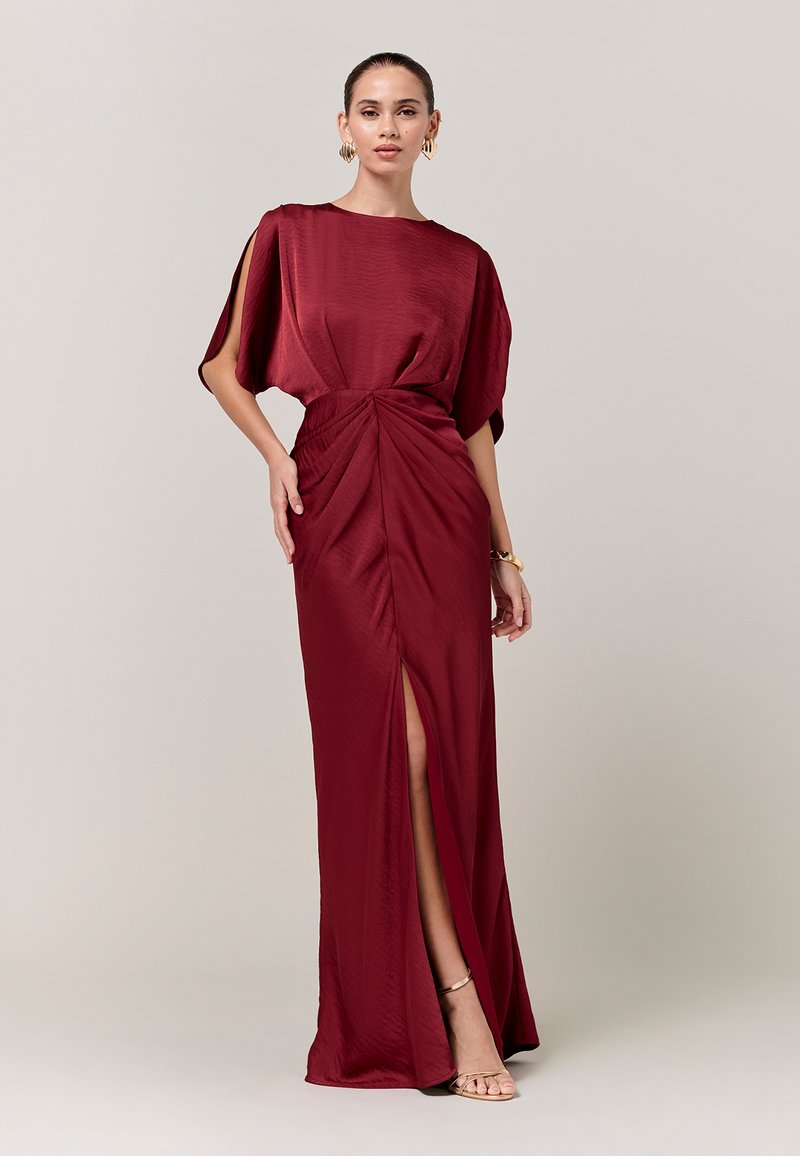 Femme en robe de soirée en satin bordeaux avec fente, manches volantées, boucles d'oreilles créoles dorées, bracelet et talons dorés à lanières sur fond neutre.