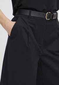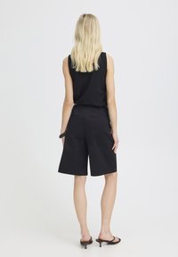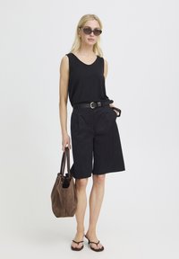 Femme portant un short noir au genou, une ceinture noire, un haut sans manches noir, un bracelet noir et des sandales à talons noires, debout devant un fond blanc.