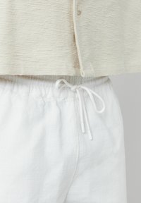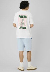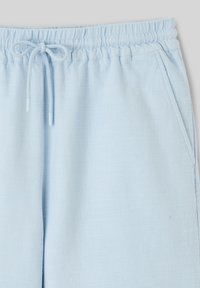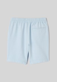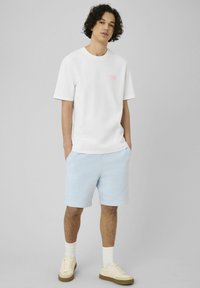 Homme portant un short bleu clair à cordon, des chaussettes blanches et des baskets blanc cassé, debout avec les mains dans les poches devant un fond gris.