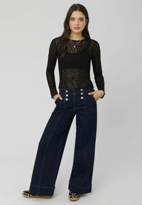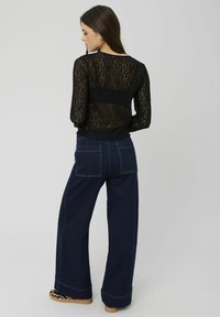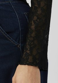 Top en dentelle noire à manches longues avec une texture semi-transparente et des bords festonnés, superposé à une couche noire unie, associé à un jean taille haute.