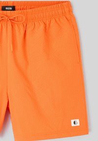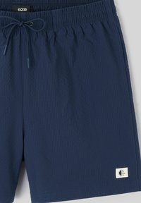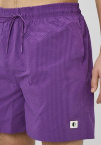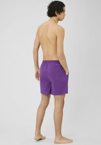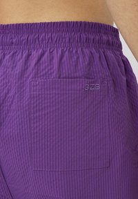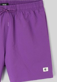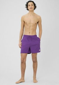 Homme portant un short de bain violet avec taille à cordon, debout pieds nus devant un fond gris clair uni.