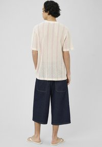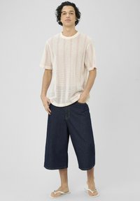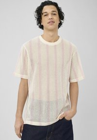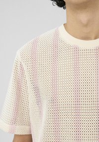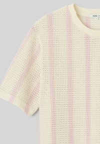 Jeune homme aux cheveux bouclés portant un t-shirt à manches courtes en maille rose clair et un jean foncé, debout devant un fond gris uni.