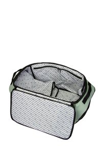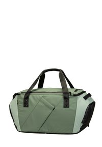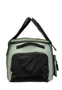 Sac de sport vert et vert clair avec poignées noires, poche avant zippée avec bande blanche, compartiments latéraux zippés, et écusson logo en cuir.