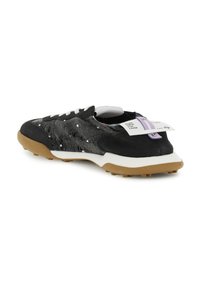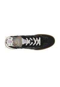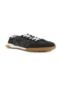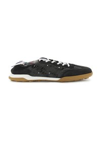 Baskets en daim noir avec lacets blancs, côtés en tissu usé, semelle en caoutchouc beige et détail violet sur la languette du talon.