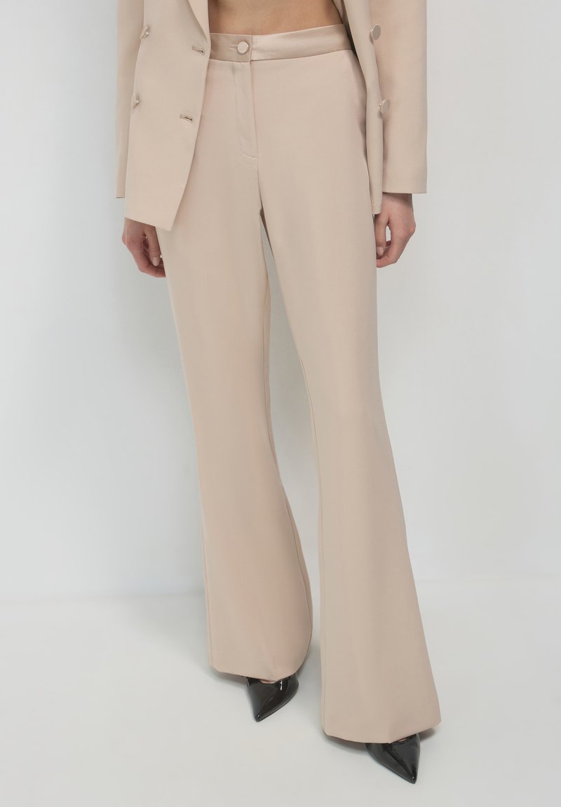 Pantalons évasés beige clair sur mesure en tissu lisse, dotés d'une taille ajustée et d'un léger éclat, assortis à des chaussures noires pointues.