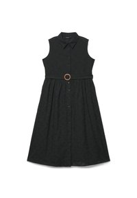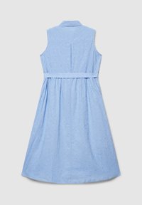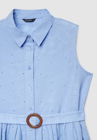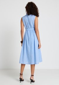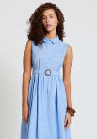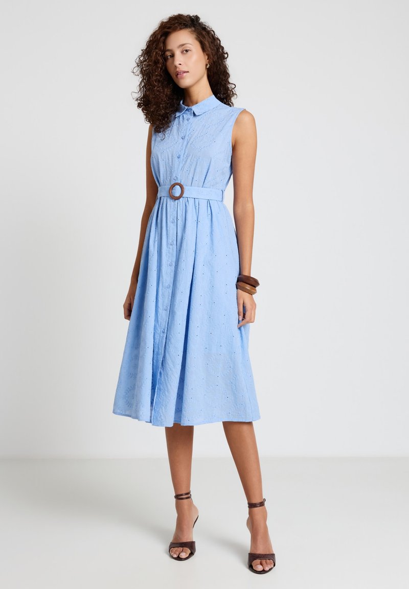 Femme portant une robe midi sans manches bleu clair à boutons sur le devant, avec col et ceinture, associée à des talons marron et des bracelets en bois.