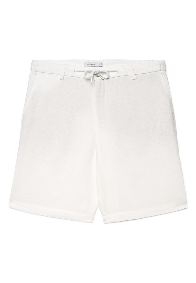 Shorts décontractés blancs avec taille à cordon, passants pour ceinture, poches latérales et une petite étiquette sur la ceinture intérieure.