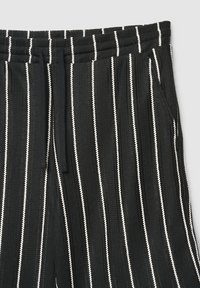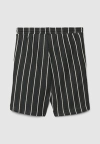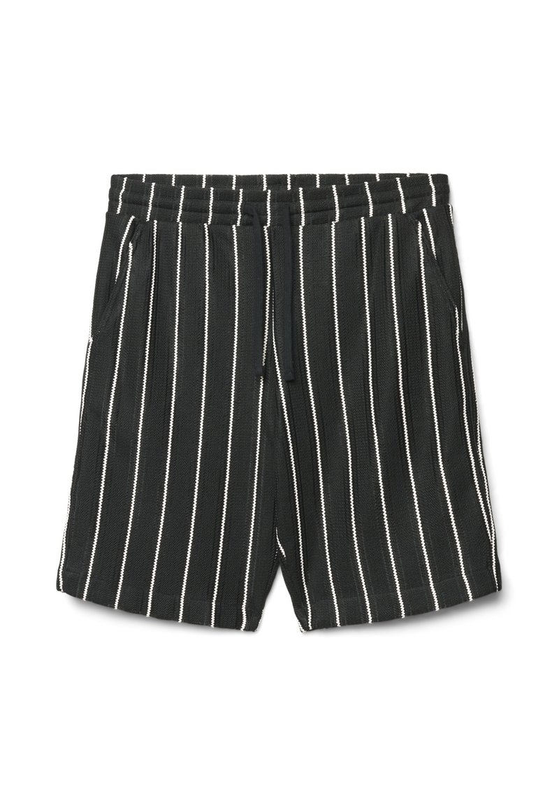 Shorts noirs à rayures verticales blanches, taille élastique avec cordon de serrage et poches latérales, posés à plat sur un fond blanc.