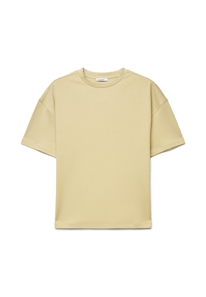 T-shirt beige à manches courtes et col rond, coupe décontractée avec épaules tombantes, présenté sur un fond blanc.