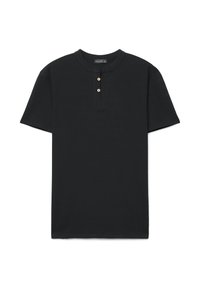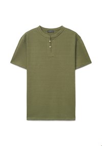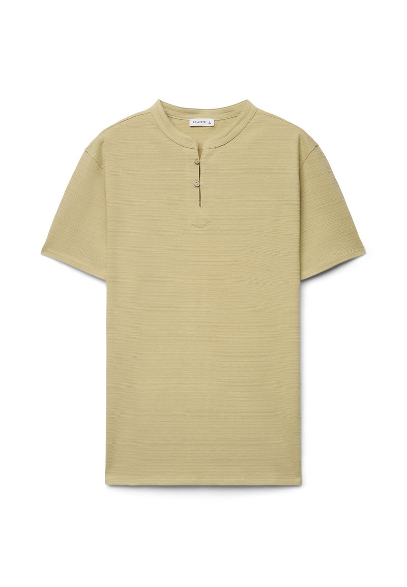 Chemise Henley beige à manches courtes avec un col rond et une patte à deux boutons, présentée sur un fond blanc.